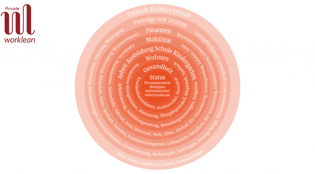 Als Idee für eine intuitiv nachvollziehbare Ablage, die zu guten Ergebnissen führt, haben wir die Ablage nach Lebensbereichen angeregt. Unsere Liste von Lebensbereichen sieht wie folgt aus: